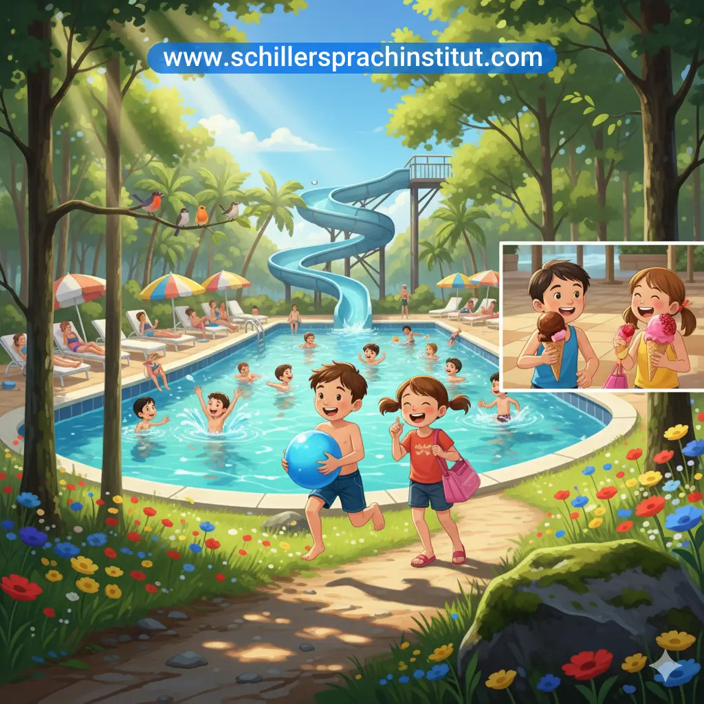 Paul und Julia sind Geschwister. Es ist Sommer, und das Wetter ist sehr heiß. Paul sagt: „Lass uns ins Schwimmbad gehen!“ Julia nimmt ihre Badetasche, und Paul bringt einen Ball mit. Im Schwimmbad gibt es viele Menschen. Die Kinder springen ins Wasser und spielen. Paul und Julia schwimmen und lachen viel. Sie kaufen auch Eiscreme. Paul nimmt Schokolade, und Julia nimmt Erdbeere. Am Nachmittag sind sie müde, aber sie hatten einen tollen Tag.